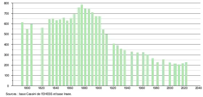 L'évolution du nombre d'habitants est connue à travers les recensements de la population effectués dans la commune depuis 1793. Pour les communes de moins de 10 000 habitants, une enquête de recensement portant sur toute la population est réalisée tous les cinq ans, les populations de référence des années intermédiaires étant quant à elles estimées par interpolation ou extrapolation[22]. Pour la commune, le premier recensement exhaustif entrant dans le cadre du nouveau dispositif a été réalisé en 2007[23].