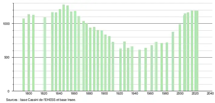 L'évolution du nombre d'habitants est connue à travers les recensements de la population effectués dans la commune depuis 1793. Pour les communes de moins de 10 000 habitants, une enquête de recensement portant sur toute la population est réalisée tous les cinq ans, les populations de référence des années intermédiaires étant quant à elles estimées par interpolation ou extrapolation[16]. Pour la commune, le premier recensement exhaustif entrant dans le cadre du nouveau dispositif a été réalisé en 2005[17].