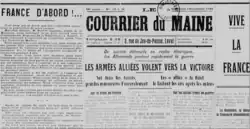Contrairement aux autres trois journaux[22] qui avaient continués à paraître en Mayenne, Le Courrier de Maine n'est pas interdit pour collaboration, ce qui reste un cas à peu près unique[23] en France. .
