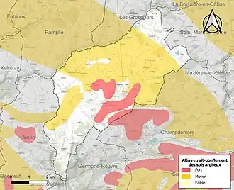 Les mouvements de terrains susceptibles de se produire sur la commune sont des tassements différentiels[16]. Le retrait-gonflement des sols argileux est susceptible d'engendrer des dommages importants aux bâtiments en cas d’alternance de périodes de sécheresse et de pluie[17]. 59,7 % de la superficie communale est en aléa moyen ou fort (54,9 % au niveau départemental et 48,5 % au niveau national)[Carte 2]. Depuis le , en application de la loi ELAN, différentes contraintes s'imposent aux vendeurs, maîtres d'ouvrages ou constructeurs de biens situés dans une zone classée en aléa moyen ou fort[Note 2],[18].