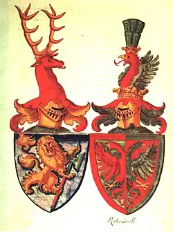 - ↑ Ce blason n'est donné qu'à titre d'illustration pour l'article, l'aigle étant peut-être déjà contournée avant le parti.