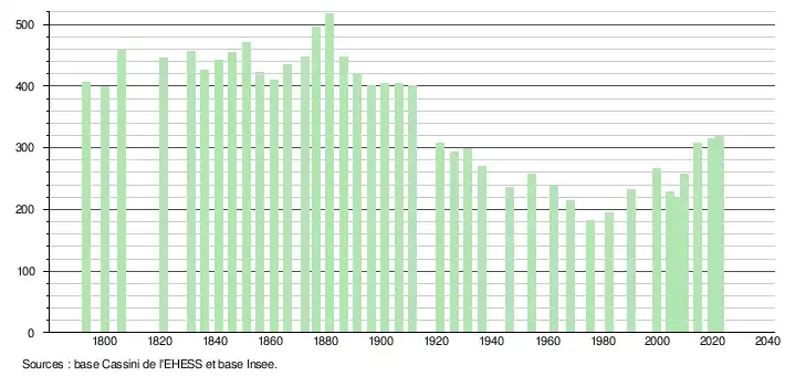 L'évolution du nombre d'habitants est connue à travers les recensements de la population effectués dans la commune depuis 1793. Pour les communes de moins de 10 000 habitants, une enquête de recensement portant sur toute la population est réalisée tous les cinq ans, les populations de référence des années intermédiaires étant quant à elles estimées par interpolation ou extrapolation[19]. Pour la commune, le premier recensement exhaustif entrant dans le cadre du nouveau dispositif a été réalisé en 2004[20].