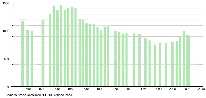 L'évolution du nombre d'habitants est connue à travers les recensements de la population effectués dans la commune depuis 1793. Pour les communes de moins de 10 000 habitants, une enquête de recensement portant sur toute la population est réalisée tous les cinq ans, les populations de référence des années intermédiaires étant quant à elles estimées par interpolation ou extrapolation[29]. Pour la commune, le premier recensement exhaustif entrant dans le cadre du nouveau dispositif a été réalisé en 2005[30].