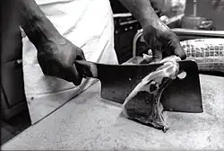Tout d'abord, la « feuille de boucher », un couperet servant à découper et aplanir la viande. Elle est constituée d'une lame variant de 2 à 5 mm de largeur et 10 à 20 cm de longueur ; sa forme rectangulaire la rend très reconnaissable.