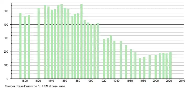 - ↑ Fiches Insee - Populations de référence de la commune pour les années 2006, 2007, 2008, 2009, 2010, 2011, 2012, 2013, 2014, 2015, 2016, 2017, 2018, 2019, 2020, 2021 et 2022.