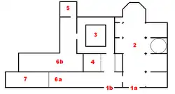 Parties: 1a. Porte de l'église, 1b. Portail du Couvent, 2. Église. 3. Cloître, 4-5. Escaliers, 6a-6b. Dépendances, 7. Grenier