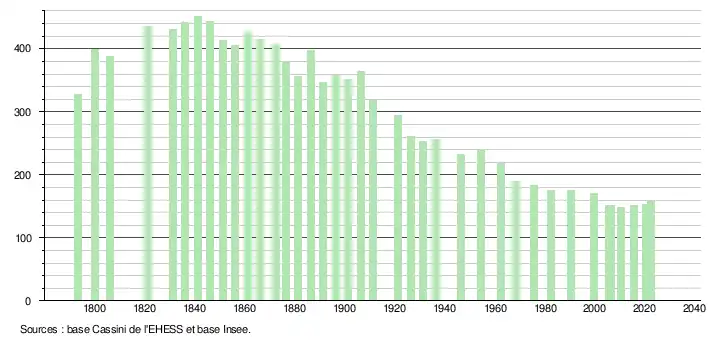 L'évolution du nombre d'habitants est connue à travers les recensements de la population effectués dans la commune depuis 1793. Pour les communes de moins de 10 000 habitants, une enquête de recensement portant sur toute la population est réalisée tous les cinq ans, les populations de référence des années intermédiaires étant quant à elles estimées par interpolation ou extrapolation[37]. Pour la commune, le premier recensement exhaustif entrant dans le cadre du nouveau dispositif a été réalisé en 2005[38].