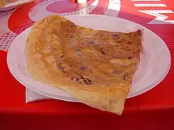 • en pays bretonnant, ou Basse-Bretagne, la crêpe de sarrasin est salée ; sa version sucrée est la crêpe bretonne de froment. Préparée à base de lait, d’œufs, de farine de froment et de farine de sarrasin, elle est plus fine, cassante quand sa cuisson est finie[27] et d'une surface non trouée.