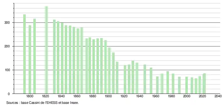 L'évolution du nombre d'habitants est connue à travers les recensements de la population effectués dans la commune depuis 1793. Pour les communes de moins de 10 000 habitants, une enquête de recensement portant sur toute la population est réalisée tous les cinq ans, les populations de référence des années intermédiaires étant quant à elles estimées par interpolation ou extrapolation[14]. Pour la commune, le premier recensement exhaustif entrant dans le cadre du nouveau dispositif a été réalisé en 2006[15].