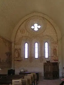 L'intérieur de cette chapelle est remarquable car ses murs nord, est et ouest sont ornés de plusieurs fresques concernant les croisades : des scènes de la victoire des croisés et de l'armée franque de Hugues le Brun de Lusignan et de Geoffroy Martel (neveu de Guillaume IV Taillefer, comte d'Angoulême) sur les Sarrasins menés par Nourreddine, dans la plaine de la Bocquée, en 1163.