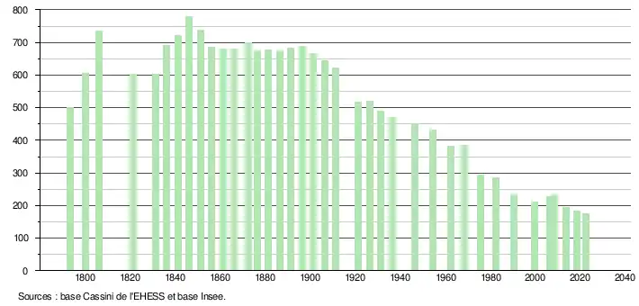 L'évolution du nombre d'habitants est connue à travers les recensements de la population effectués dans la commune depuis 1793. Pour les communes de moins de 10 000 habitants, une enquête de recensement portant sur toute la population est réalisée tous les cinq ans, les populations de référence des années intermédiaires étant quant à elles estimées par interpolation ou extrapolation[12]. Pour la commune, le premier recensement exhaustif entrant dans le cadre du nouveau dispositif a été réalisé en 2008[13].