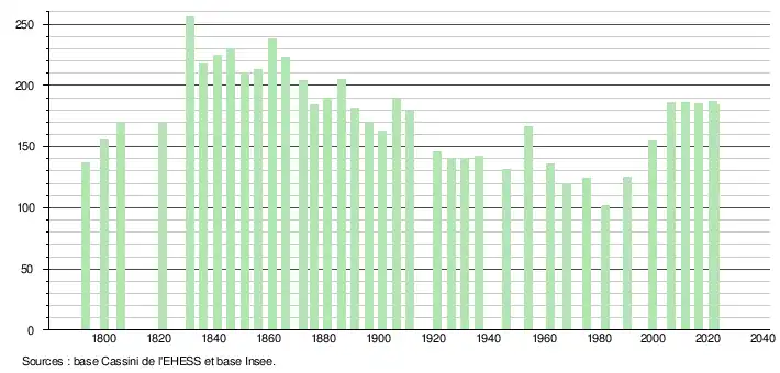 L'évolution du nombre d'habitants est connue à travers les recensements de la population effectués dans la commune depuis 1793. Pour les communes de moins de 10 000 habitants, une enquête de recensement portant sur toute la population est réalisée tous les cinq ans, les populations de référence des années intermédiaires étant quant à elles estimées par interpolation ou extrapolation[23]. Pour la commune, le premier recensement exhaustif entrant dans le cadre du nouveau dispositif a été réalisé en 2006[24].