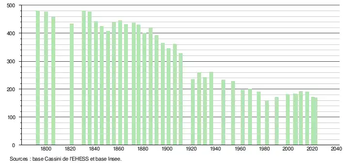 L'évolution du nombre d'habitants est connue à travers les recensements de la population effectués dans la commune depuis 1793. Pour les communes de moins de 10 000 habitants, une enquête de recensement portant sur toute la population est réalisée tous les cinq ans, les populations de référence des années intermédiaires étant quant à elles estimées par interpolation ou extrapolation[29]. Pour la commune, le premier recensement exhaustif entrant dans le cadre du nouveau dispositif a été réalisé en 2005[30].