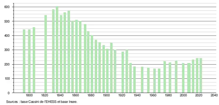 L'évolution du nombre d'habitants est connue à travers les recensements de la population effectués dans la commune depuis 1793. Pour les communes de moins de 10 000 habitants, une enquête de recensement portant sur toute la population est réalisée tous les cinq ans, les populations de référence des années intermédiaires étant quant à elles estimées par interpolation ou extrapolation[15]. Pour la commune, le premier recensement exhaustif entrant dans le cadre du nouveau dispositif a été réalisé en 2007[16].