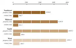 Les États-Unis publient diverses statistiques qui montrent des taux qui oscillent de 2 000 à 4 000 atteintes aux biens et 390 à 540 crimes violents pour 100 000 habitants[12],[13], soit des taux variant de 20 à 40 pour 1 000 habitants. Dans la Revue française de criminologie et de droit pénal, Heather Mac Donald s'interroge sur l'excessive sévérité du système pénal américain[14]. Selon lui, les États-Unis connaissent actuellement une campagne médiatique de grande ampleur visant à délégitimer la répression de la criminalité. Il affirme notamment que « l'Amérique n'a pas un problème de population carcérale mais un problème de criminalité ».