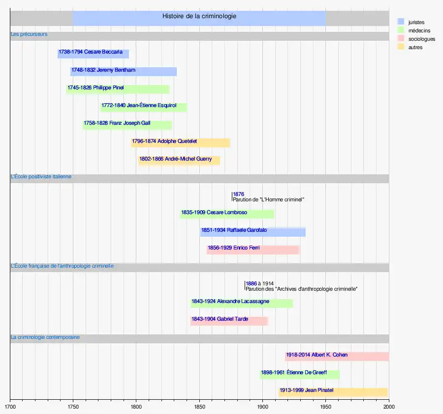 Au-delà de ces questions de terminologie, il reste difficile de déterminer avec précision la date de naissance de la criminologie, chaque auteur[Lesquels ?] semblant « choisir » la date qui correspond le mieux à sa conception même de la discipline[1]. Il est toutefois possible d'identifier quelques grands mouvements qu'a connu le sujet.
