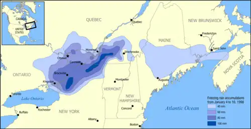 Le verglas a particulièrement touché les villes ontariennes d'Ottawa et Kingston, le Sud-Ouest du Québec, l'extrême Sud du Nouveau-Brunswick, la Nouvelle-Écosse, le Nord de l'État de New York et des régions des États du Vermont, New Hampshire et Maine[1],[2]. Au Québec, les régions de Montréal et de la Montérégie ont été les plus touchées[1].