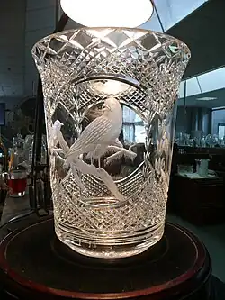 Dans le second, les ornements sont dessinés au laser, donc brûlés, marqués avec précision par un faisceau lumineux très fin mais de forte intensité, au travers d'une lentille. En 1976, la gravure au laser en 3D (ou en relief), récemment mise au point, permit de graver mécaniquement le cristal.
