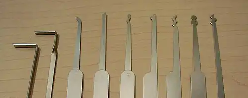 - râteau (parfois simplement appelé "racleur" qui désigne en fait la famille des crochets utilisés pour ouvrir une serrure par raclage.) ;