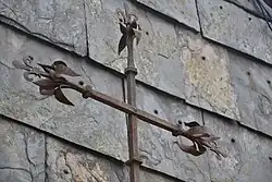 Cette croix en fer forgé date du XVIe siècle. Ses extrémités se terminent par des fleurs de lys. Le montant vertical est composé par une longue tige octogonale, mais qui devient carrée et moulurée dans sa partie inférieure.
