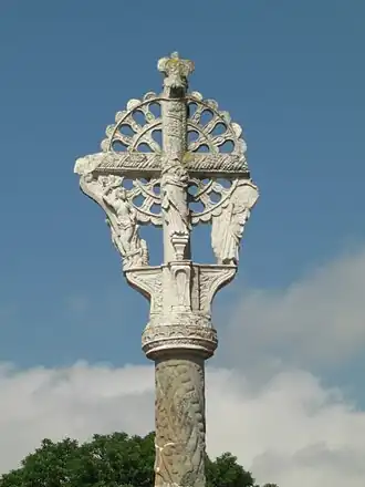 La croix, en grès, comporte des motifs végétaux et religieux ; en particulier le Christ et la Vierge et des saints (saint Nicolas, saint Martin, sainte Madeleine)[2].