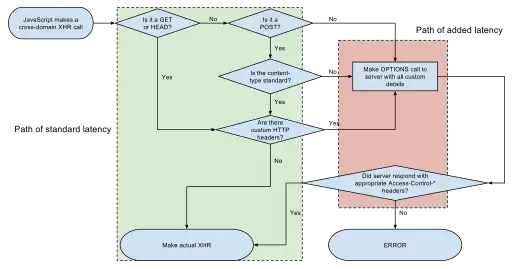 Pour Ajax et les méthodes de requête HTTP qui peuvent modifier des données (généralement des méthodes HTTP autres que GET, ou pour l'utilisation de POST avec certains types MIME), la spécification mandate que les navigateurs "contrôlent la requête en amont", en sollicitant les méthodes prises en charge par le serveur via une méthode de requête HTTP OPTIONS, puis, lors de "l'approbation" par le serveur, l'envoi de la requête réelle avec la méthode de requête HTTP. Les serveurs peuvent également informer les clients si les "informations d'identification" (y compris les cookies et les données d'authentification HTTP) doivent être envoyées avec la demande[7].