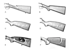 - Crosse anglaise : Type de crosse plus droite, caractéristique des armes anglaises, sans poignée pistolet.