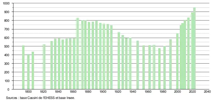 L'évolution du nombre d'habitants est connue à travers les recensements de la population effectués dans la commune depuis 1793. Pour les communes de moins de 10 000 habitants, une enquête de recensement portant sur toute la population est réalisée tous les cinq ans, les populations de référence des années intermédiaires étant quant à elles estimées par interpolation ou extrapolation[32]. Pour la commune, le premier recensement exhaustif entrant dans le cadre du nouveau dispositif a été réalisé en 2004[33].