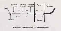 La durée totale du cycle de développement varie entre 12 et 174 jours selon la température et l’hygrométrie du lieu[4].