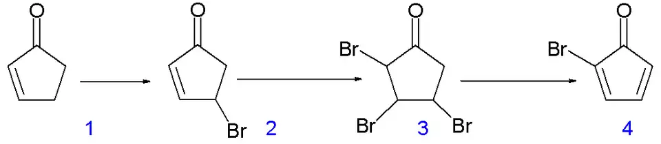 le N-bromosuccinimide (NBS) dans le tétrachlorométhane (CCl4) insère un atome de brome allylique sur 1.1 pour produire le composé 1.2, qui par poursuite de bromation avec du brome dans un mélange pentane/dichlorométhane donne le composé tribromé 1.3. Deux équivalents de bromure d'hydrogène (HBr) sont éliminés de ce composé par la diéthyl amine dans l'éther diéthylique pour former la 2-bromo cyclopentadiènone 1.4.
