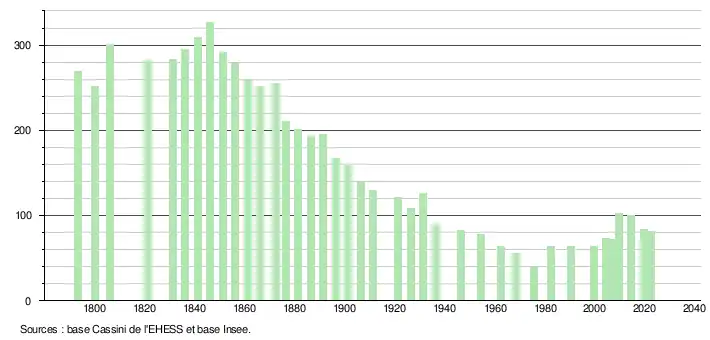 | L'évolution du nombre d'habitants est connue à travers les recensements de la population effectués dans la commune depuis 1793. Pour les communes de moins de 10 000 habitants, une enquête de recensement portant sur toute la population est réalisée tous les cinq ans, les populations de référence des années intermédiaires étant quant à elles estimées par interpolation ou extrapolation[32]. Pour la commune, le premier recensement exhaustif entrant dans le cadre du nouveau dispositif a été réalisé en 2004[33]. En 2022, la commune comptait 81 habitants[Note 4], en évolution de −20,59 % par rapport à 2016 (Aude : +2,65 %, France hors Mayotte : +2,11 %). |