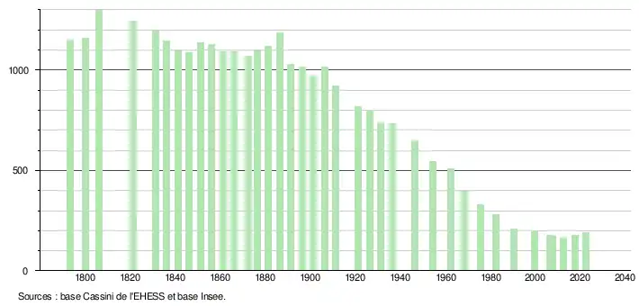 L'évolution du nombre d'habitants est connue à travers les recensements de la population effectués dans la commune depuis 1793. Pour les communes de moins de 10 000 habitants, une enquête de recensement portant sur toute la population est réalisée tous les cinq ans, les populations de référence des années intermédiaires étant quant à elles estimées par interpolation ou extrapolation[34]. Pour la commune, le premier recensement exhaustif entrant dans le cadre du nouveau dispositif a été réalisé en 2007[35].