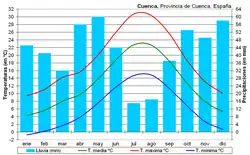 Le climat de Cuenca est de type méditerranéen continental, avec des températures froides en hiver et douces en été, et une importante oscillation thermique journalière pendant toute l'année, plus prononcée pendant les mois les plus chauds. Les précipitations sont plus abondantes que dans la région qui l'environne, à cause de l'orographie montagneuse, qui dépasse les 500 mètres et présente de rares précipitations en été.