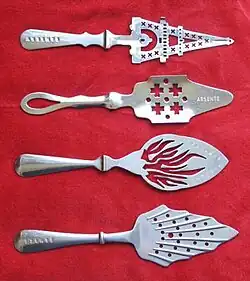 • Cuillère à absinthe : sans volume proprement dit car son cuilleron plat est percé, de forme grossièrement triangulaire, inventée au milieu du XIXe siècle. On pose le cuilleron sur les bords du verre, on y dépose du sucre en morceau, qui fond sous l'action de l'eau que l'on verse très lentement dessus et qui tombe dans le verre où ont été préalablement versés quelques centilitres d'absinthe.