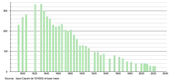 L'évolution du nombre d'habitants est connue à travers les recensements de la population effectués dans la commune depuis 1793. Pour les communes de moins de 10 000 habitants, une enquête de recensement portant sur toute la population est réalisée tous les cinq ans, les populations de référence des années intermédiaires étant quant à elles estimées par interpolation ou extrapolation[28]. Pour la commune, le premier recensement exhaustif entrant dans le cadre du nouveau dispositif a été réalisé en 2004[29].