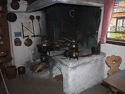 La cuisine prend le relais, seulement au XXe siècle dans les maisons paysannes, de l'ancienne « chambre à feu », lieu de vie domestique où se préparaient et se consommaient les aliments cuits dans l'âtre.