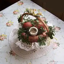 Cuisine de Pâques en Roumanie, comprenant notamment des œufs teints en rouge, du drob (tarte d'agneau), du cozonac (brioche) et du pască (gâteau).