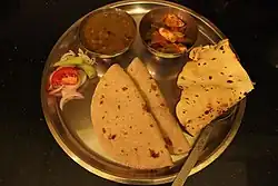 - cuit à sec (plaque de cuisson indienne), jowar ki roti, baajre ki roti et makki ki roti (parfois enduits de beurre clarifié) ;