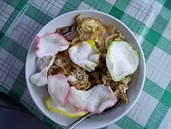 - Krupuk : galettes frites faites avec de la pâte de crevettes séchées.