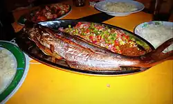 Soumbala lafri, au poisson ou au poulet frit: accompagné de riz, gombos, aubergines, etc.