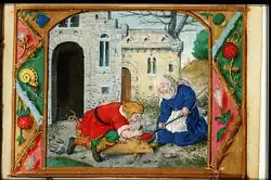 Le fromage était bien plus important pour les catégories plus démunies, et il a été avancé qu'il a longtemps été la principale source de protéines animales pour les plus pauvres[73]. De nombreuses variétés consommées aujourd'hui, comme l'édam hollandais, le brie français et le parmesan italien, existaient déjà à la fin du Moyen Âge. On trouvait également des fromages fabriqués à partir du petit-lait, comme le ricotta, qui étaient des sous-produits de la production d'autres fromages. Le fromage était utilisé dans la fabrication de tourtes et de soupes. Le beurre, un autre important produit laitier, était populaire dans les régions d'Europe du Nord qui s'étaient spécialisées dans l'élevage à partir du milieu du Moyen Âge, comme les Pays-Bas, ou le sud de la Scandinavie. Le beurre remplaçait l'huile historique du sud ou bien le lard comme graisse alimentaire dans ces régions. Sa production permit un lucratif commerce du beurre à partir du XIIe siècle[74].