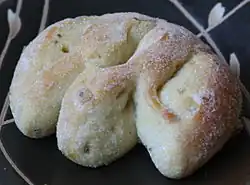 La fougasse est un pain provençal. Le nom trouve son origine dans le latin panis focacius, un pain plat cuit sur un foyer ou sous les cendres d'un feu. Elle ressemble à la pizza[15], bien qu'elle n'ait aucun lien historique connu avec cette dernière. Elle est assez plate, souvent sculptée à la préparation, pour former plusieurs branches. Il existe une extrême diversité des fougasses, chaque région provençale, ville ou même chaque famille ayant sa propre recette. La plupart des fougasses sont salées, elles peuvent être agrémentées de divers ingrédients (olives, lardons, anchois, fromages), qui peuvent être soit mélangés à la préparation, soit déposés à la surface du pain avant cuisson. Mais on trouve aussi la fougasse d'Aigues-Mortes, qui est sucrée, et la fougassette de Grasse, qui est légèrement briochée et aromatisée à la fleur d'oranger.
