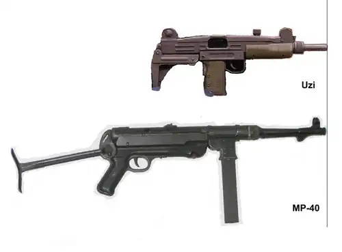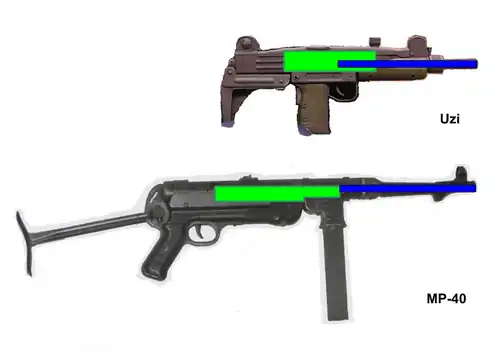 Comme le montrent les schémas de droite, le concept de base d'une culasse recouvrante avec le magasin dans la poignée produit des armes beaucoup plus compactes. Ces schémas montrent le pistolet-mitrailleur MP-40 conçue en 1938 (mise en service 1939), qui a 630 mm (25 pouces) de long avec la crosse pliée, pèse quatre kilogrammes (8,8 livres) et ayant un canon de 251 mm (9,9 pouces) et (avec des matériaux et une technologie de production similaire) l'Uzi, un modèle conçu en 1948 (adopté en 1951 en mis en service en 1954), qui est long de 470 mm (19 pouces) avec la crosse pliée, pèse 3,5 kilogrammes (7,7 livres) et a un canon de 260 mm (10,2 pouces).