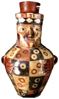 La culture Tiwanaku se développa sur les hauts plateaux entre 550 et 900[4] : son influence sur les Huari est notable dans le domaine religieux et les rites funéraires. Sur certaines céramiques, apparaît la représentation de divinités aux traits anthropomorphes et zoomorphes, similaires à ceux de Viracocha (« dieu des bâtons ») de la culture Tiwanaku. La présence de la culture Tiwanaku ou Tiahuanaco à Ayacucho est aussi attestée par la représentation d’une divinité gravée sur la « Porte du Soleil » située au sommet de la pyramide d'Akapana dans l'enclos de Kalasasaya (en Bolivie). Cette image, tout comme les « anges » qui l’accompagnent, est dessinée sur de grandes urnes d’Ayacucho, que l’on connait sous le nom de style conchopata, car ce style est issu de cette localité.