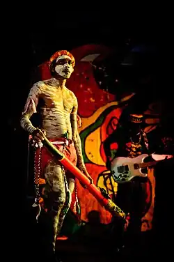 Les droits d'accès aux chants et danses relatifs à une cérémonie spécifique appartenant à un certain groupe défini (appelés manikay par les peuples Yolngu du nord-est de la Terre d'Arnhem, ou chants de clan[15]) ; certains peuvent être partagés avec des personnes extérieures à la communauté, mais d'autres ne sont jamais partagés. Il existe un large éventail de chants, de danses, de musique, d'ornements corporels, de costumes et de symbolisme, destinés à relier le corps au monde spirituel des ancêtres. Les cérémonies aident à maintenir l'identité des Aborigènes d'Australie (en) ainsi que le lien du groupe avec le pays et la famille[12].