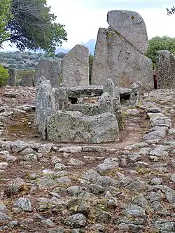 L’architecture funéraire délaisse les allées couvertes au profit des tombes des géants, avec la stèle « centinata » et ample exèdre, comme à Su Quaddu de Nixias. La chambre funéraire est creusée dans la terre et la zone sépulcrale est délimitée par des orthostates non revêtues de pierres. À côté de l'entrée se trouvent deux fausses petites portes, une de chaque côté.