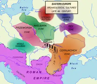 La fin de la culture de Tcherniakhov, au Ve siècle, est attribuée à l’invasion des Huns[8]. On ne cherche plus à l'expliquer par une migration en masse de la population, quoique les Goths aient effectivement migré en partie vers l'ouest : les théories actuelles y voient plutôt le résultat d'une déliquescence des structures politiques qui faisaient sa cohésion. John Mathews estime que, par delà son homogénéité culturelle, il s'y était maintenu des distinctions ethniques. Avec la chute de l'élite gothe, certains éléments autochtones ont persisté[22], et se sont même éparpillés territorialement : phénomène associé avec l’avènement et l’expansion des Protoslaves.