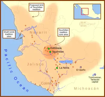Le site archéologique de Guachimontones, situé juste en dehors de la Teuchitlán des temps modernes, dans l’état de Jalisco, est le site le plus grand et le plus complexe de la tradition de Teuchitlan[5]. Le centre de l'ancienne cité était occupé par trois zones circulaires, chacune avec en son centre une pyramide circulaire s’étageant sur plusieurs niveaux. Il existe au total dix de ces "cercles" à Teuchitlan, s’étendant sur quatre places rectangulaires et deux jeux de pelote parmi beaucoup d'autres structures plus petites[6].