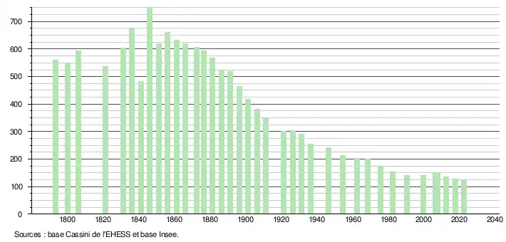 L'évolution du nombre d'habitants est connue à travers les recensements de la population effectués dans la commune depuis 1793. Pour les communes de moins de 10 000 habitants, une enquête de recensement portant sur toute la population est réalisée tous les cinq ans, les populations de référence des années intermédiaires étant quant à elles estimées par interpolation ou extrapolation[21]. Pour la commune, le premier recensement exhaustif entrant dans le cadre du nouveau dispositif a été réalisé en 2007[22].