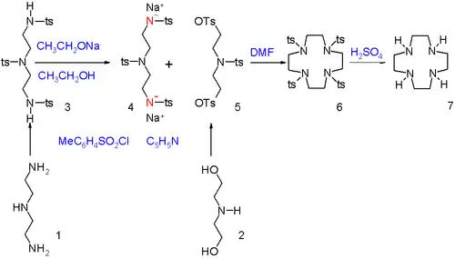 Il peut être obtenu en combinant deux substitutions nucléophiles au chlorure de tosyle sur la diéthylènetriamine (1 ci-dessous) et la diéthanolamine (2) dans la pyridine[4] :